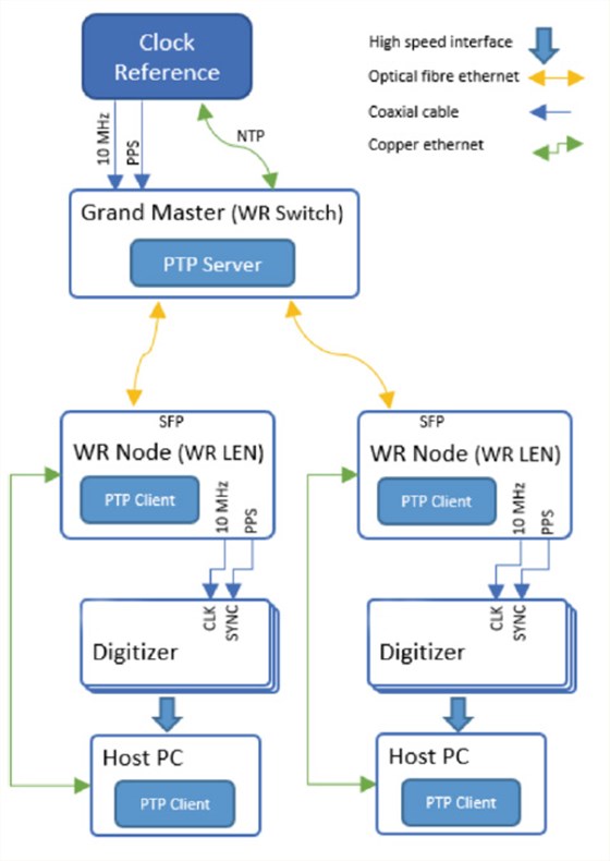 白兔(WR)为使用同步以太网的大型分布式数据采集系统的同步提供亚纳秒精度和皮秒精度,可用于远距离同步数据采集模块。