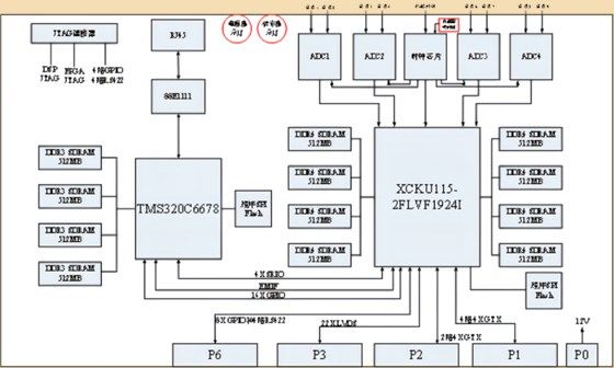 系统主要由ADC模块、FPGA及DDR模块、DSP及DDR模块、配置及接口模块、电源模块以及VPX连接器部分组成。ADC模块由4片ADI的高速ADC芯片AD9689-2600与相应的时钟电路组成;FPGA及DDR模块包含1颗XCKU115-2FLVF1924I和2组共8颗16bit4Gb的DDR4-2400SDRAM;DSP及DDR模块包含1颗TMS320C6678和1组4颗16bit4Gb的DDR3-1333SDRAM;配置及接口模块支持FPGA和DSP程序的在线下载和SPI FLASH的烧写,以及各个对外接口的驱动,可以方便用户进行实时多算法处理的在线测试验证;电源模块采用单一12V供电,经过多颗电源转换芯片产生系统工作需要的各路电源;VPX连接器采用VITA推荐的TE型号,完全满足VITA规范。